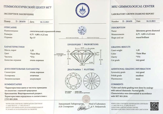 Наши алмазы и бриллианты абсолютно идентичны природным и имеют такую же кристаллическую решетку, что и алмаз, добытый из земли. Мы создаем бриллианты, которые получают сертификаты от уважаемых мировых институтов GIA, HRD, IGI, МГУ с указанием их цвета, размера, чистоты и с обязательным упоминанием, что этот камень выращен в лабораторных условиях.